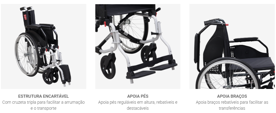 Os apoia pés destacáveis e ajustáveis em altura, junto com o patim de termoplástico rebatível e os apoia braços rebatíveis, oferecem conforto e facilidade nas transferências.